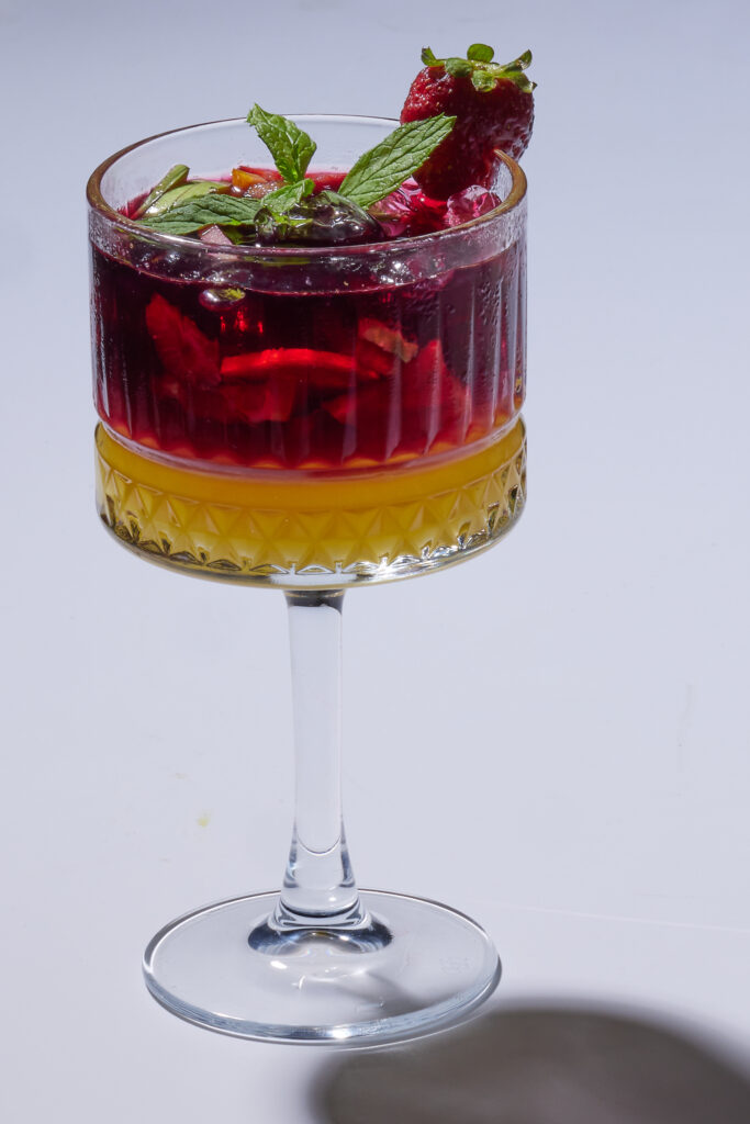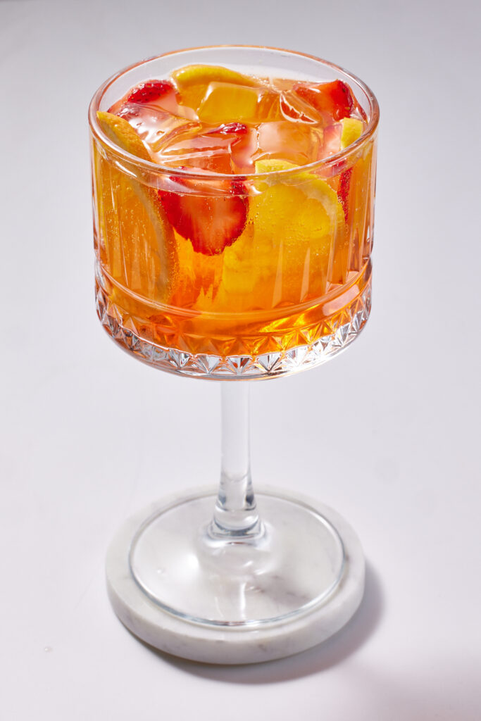 Aperol, beyaz şarap, soda, taze çilek ve portakal